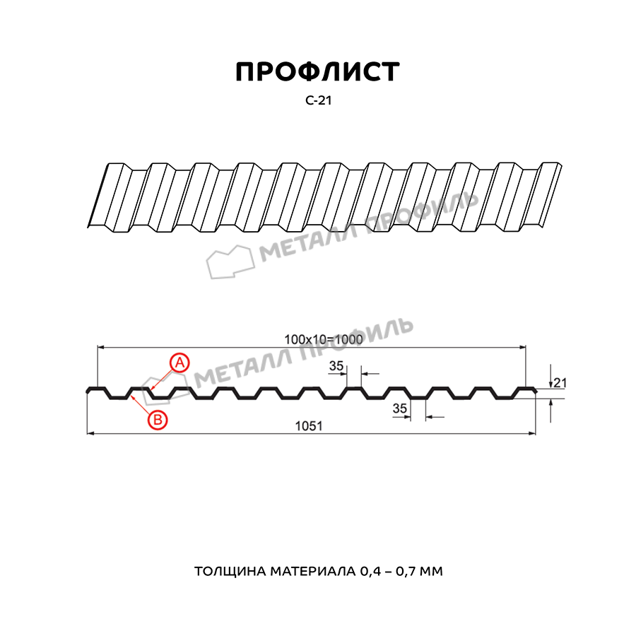 Профлист с пометкой С-21 означает, что это «стеновой» вариант с глубиной волны 21 мм. Тем не менее, С-21 – один из наиболее универсальных стройматериалов, применяемый не только для фасадов. Он будет уместен как для облицовки стен, так и для монтажа кровли, возведения ограждений. С успехом С-21 находит применение при создании складских помещений, торговых павильонов, быстровозводимых зданий, а также в качестве элемента сэндвич-панелей. С-21 отлично подходит в качестве стройматериала для Профилированного листа. Этому способствует его хорошая несущая способность. Расположенные на небольшом расстоянии друг от друга трапециевидные волны образуют рёбра жёсткости. А симметричный рисунок профиля, одинаковый с обеих сторон, обеспечивает Профилированному листу гармоничный облик. По вашему заказу мы изготовим профиль С-21 в различной толщине металла от 0,4 до 0,7 мм. Для повышения срока эксплуатации и внешней привлекательности, профлист изготавливается с финишным покрытием различных цветов и текстур, включая покрытия под кирпич, камень, дерево.