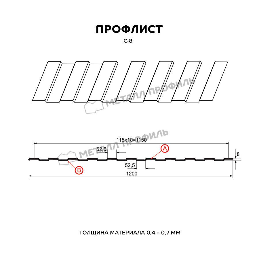 Профилированный лист с самой маленькой трапецией в каталоге Компании Металл Профиль. Назначение профиля С-8 – по большей части декоративная задача, чем несущая. С-8 замечательно справляется с такими задачами, как: системы подвесных потолков, монтаж вентилируемых фасадов, постройка заборов, не подверженных большим климатическим нагрузкам, внутренняя облицовка промышленных помещений. Зеркальная конфигурация проката делает С-8 универсальным материалом для разнообразных архитектурных замыслов. Достаточная толщина металла – от 0,4 до 0,7 мм даёт возможность профнастилу прекрасно справляться с любым своим назначением. А большая полезная ширина (1150 мм) помогает сэкономить на закупке профлистов. По вашему заказу мы можем изготовить листы металлопроката длиной от 0,5 до 12 метров.