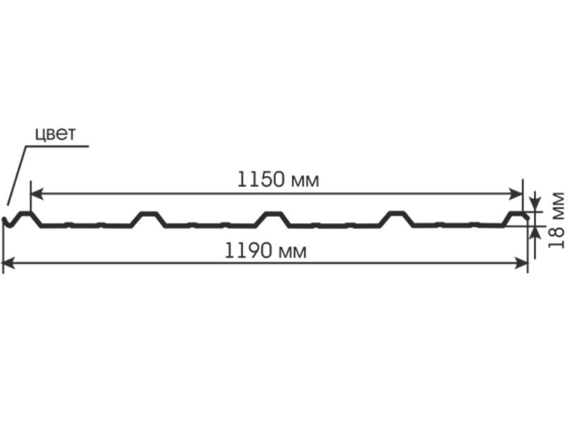 Профнастил С18 выпускается несимметричным волнистым или трапециевидным профилем, высота которого составляет 18 мм. Прокатываются листы с полезной шириной в трех размерах как 800мм, 900мм, 1000мм что дает возможность использовать листы без остатков. Данный тип имеет несколько дополнительных ребер жесткости для предания устойчивости и прочности. Герметичность конструкции достигается за счет дополнительных канавок с узкого края профиля. Подобная модификация и толщина металла от 0,4 до 0,9 мм гармонично совмещает в себе прочностные параметры с эффектным обликом. Широкое применение профнастила достигается за счет удачного сочетания характеристик: кровельные покрытия, быстровозводимые здания, навесы, облицовка зданий и изготовление утепленных сэндвич-панелей. В качестве исходного сырья для изготовления С18 выступает оцинкованная тонколистовая сталь. Она прекрасно переносит даже тяжёлые климатические нагрузки: агрессивный ультрафиолет, ветер, тяжёлый снег. А защитное полимерное покрытие дополнительно предотвращает ржавение и прочие окислительные реакции.
